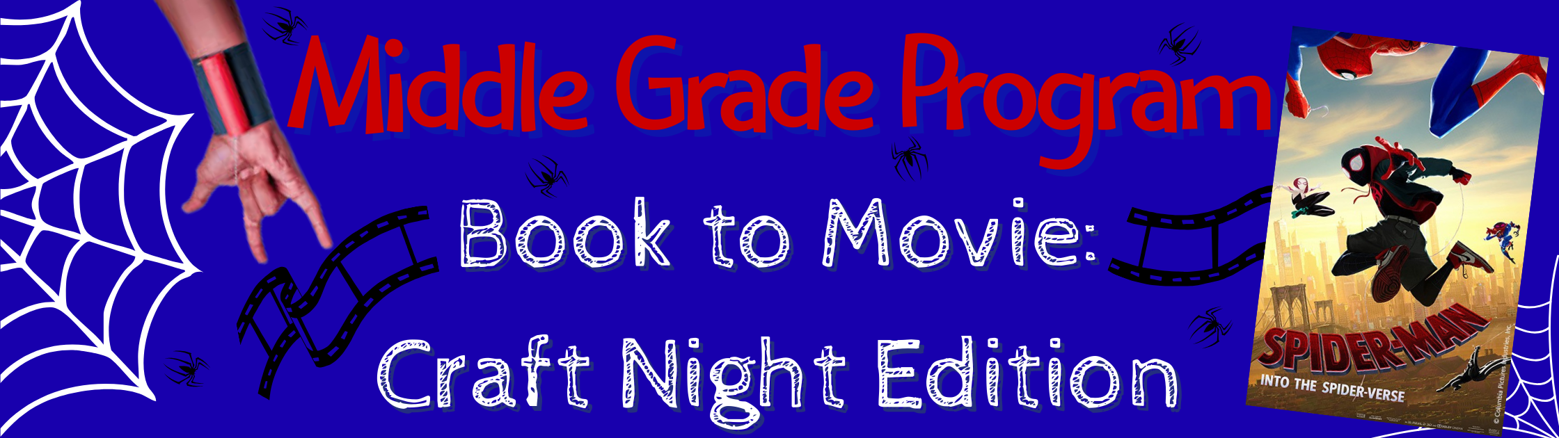 Join us for a showing of Spider-Man: Into the Spider-Verse! Watch a movie, make a craft, enjoy some snacks. What more could you ask for? Reading optional (though it does make for some great debate when comparing the film!). We’ll be making our own webshooters during the film that you get to take home! No registration required