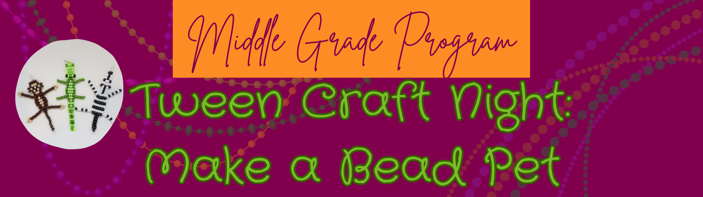 Want a cute pet with none of the work? Join us for a craft night to make your own bead pet! We’ll provide crafting materials and snacks. Registration is preferred. Registrants will be given priority if supplies are limited.