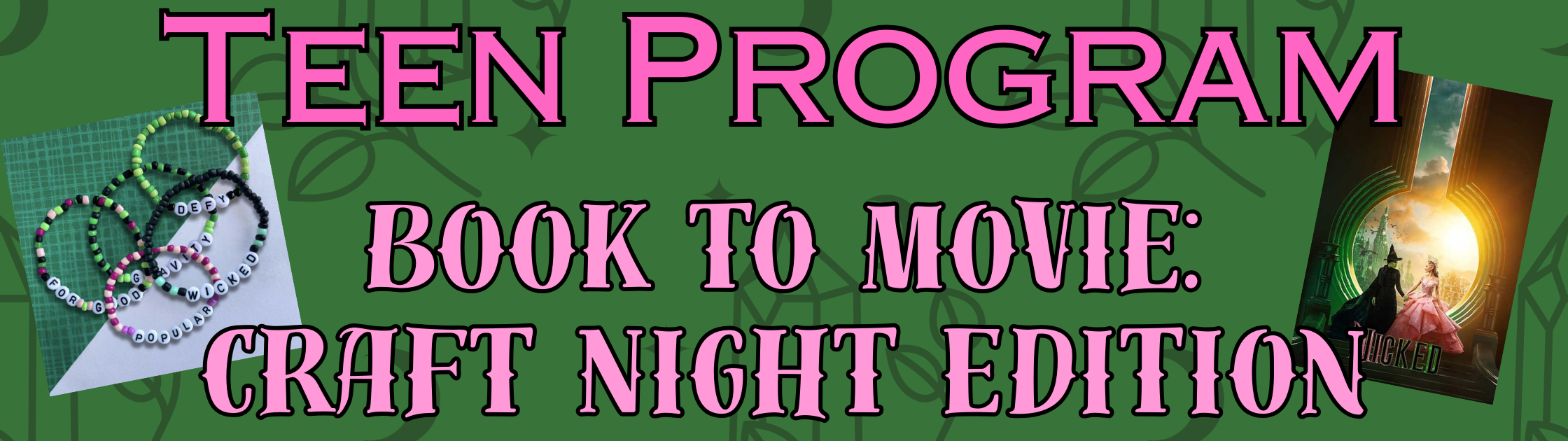 Join us for a showing of Wicked (part 1). Watch a movie, make a craft, enjoy some snacks! What more could you ask for? Reading optional (though it does make for some great debate when comparing the film!). We’ll be making Wicked-themed friendship bracelets during the film that you get to take home! No registration required.